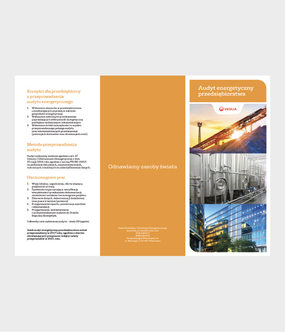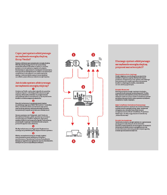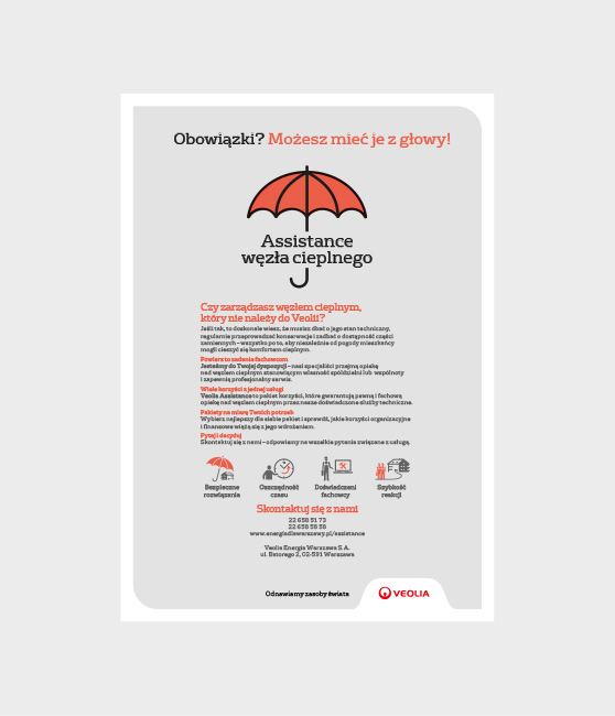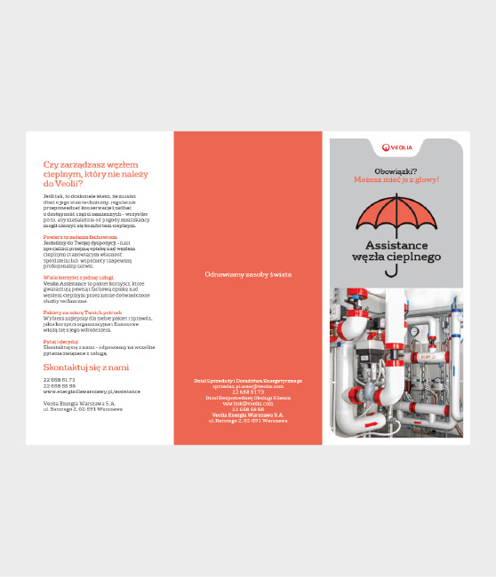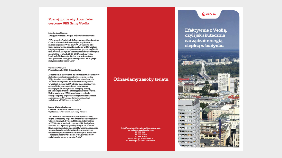Veolia Energia Warszawa (VEW) jest bezpośrednim kontynuatorem firmy Dalkia, zarządza siecią na terenie Warszawy i jest głównym dostawcą energii cieplnej. Pod koniec 2019 roku Definition Design podjęło z VEW współpracę w zakresie przygotowania materiałów wsparcia sprzedaży. Wraz z rozszerzaniem oferty jej usług, powstają broszury informacyjne B2B, ogłoszenia prasowe i projekty dla mediów elektronicznych. Wszystkie rozwiązania graficzne zgodne są z wytycznymi systemu identyfikacji wizualnej, który koncern energetyczny Veolia stosuje w sposób jednolity na wszystkich rynkach.